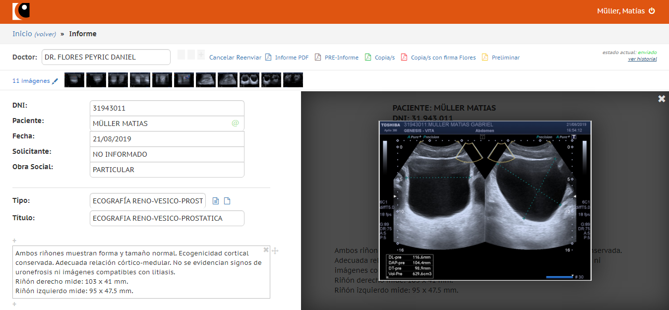 Sistema de informes ecográficos con funcionalidades para todo el staff del consultorio según sus roles, así como para los pacientes. Realiza generación de PDFs y envíos automáticos por email. Incluye textos automáticos, autocorrecciones ortográficas, plantillas de informes, una interfaz de edición muy rápida y fluida, entre otros features...