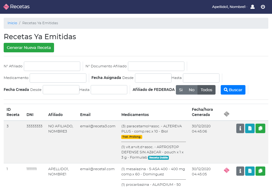 Sistema de emisión de recetas médicas desarrollado para una Obra Social que provee acceso a médicos para emitir sus recetas en formato PDF, incluyendo indicación de recetas con duplicados, especificaciones sobre los medicamentos indicados, y más características.